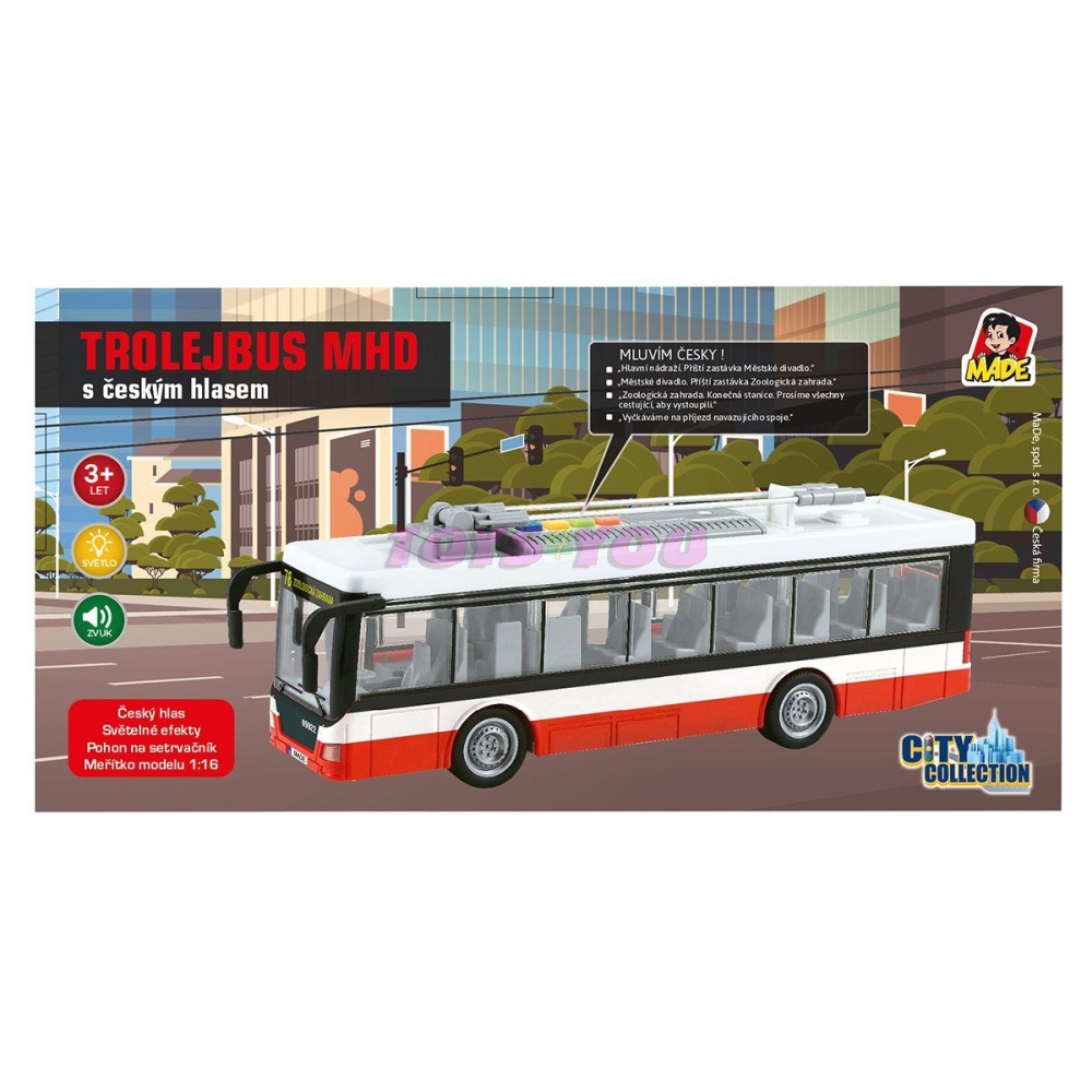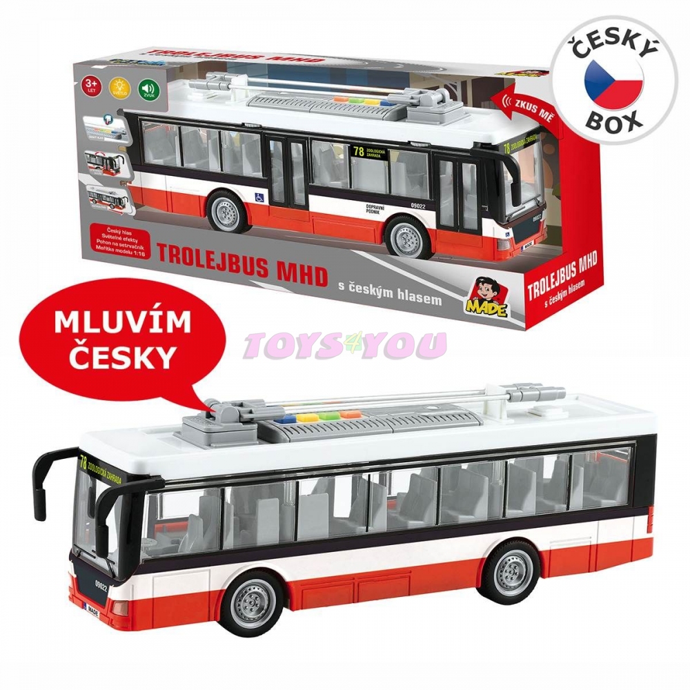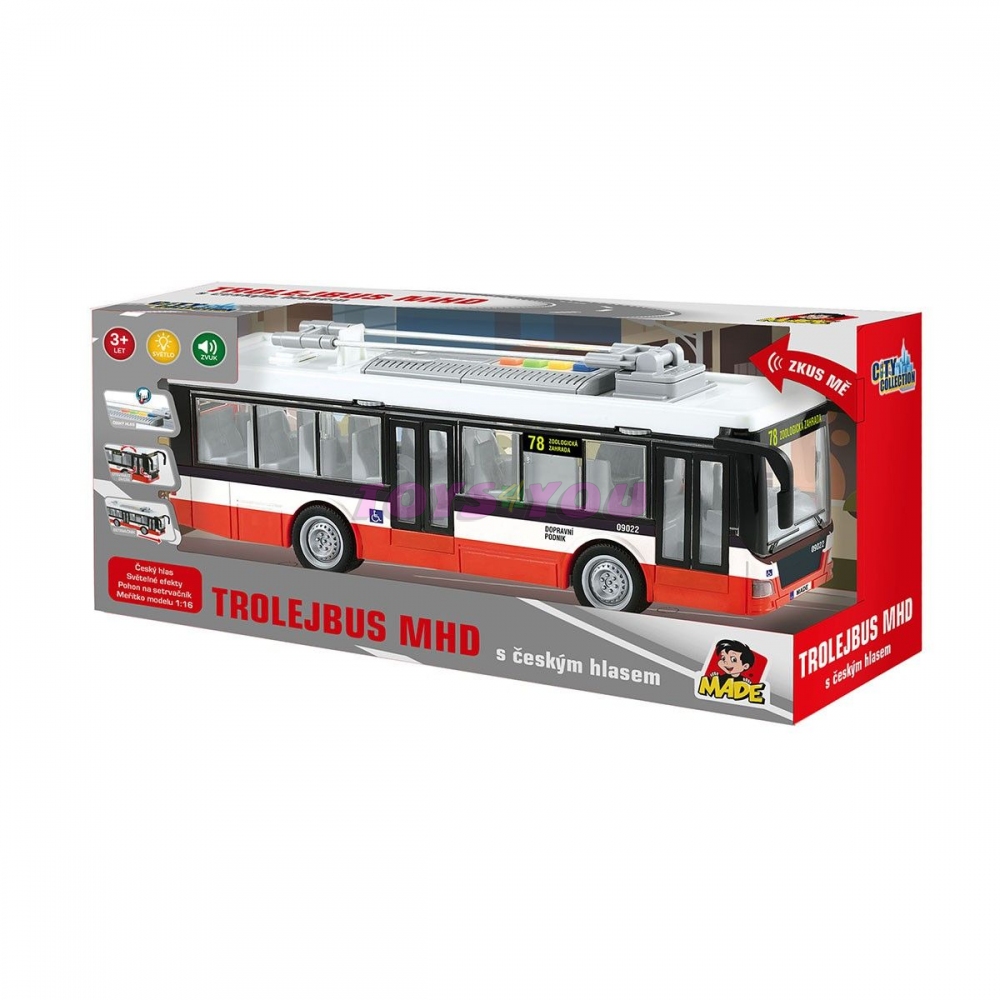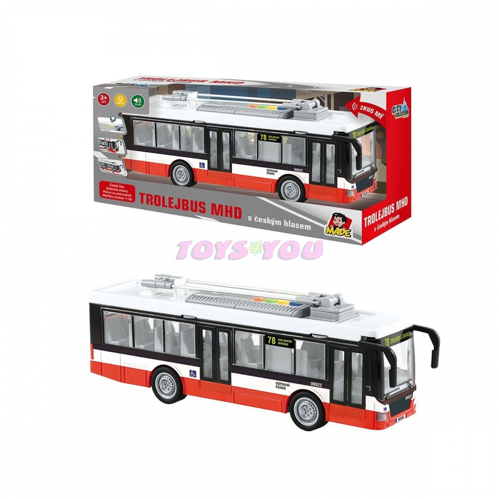 Trolejbus městské hromadné dopravy s pohonem na setrvačník s českým hlasem a světelnými efekty. Pogumovaná kolečka. Model má mechanicky otevíratelné dveře. Trolejbus přehrává tato hlášení: Hlavní nádraží, příští zastávka Městské divadlo. Městské divadlo, příští zastávka Zoologická zahrada. Zoologická zahrada, konečná stanice. Prosíme všechny cestující aby vystoupili. Vyčkáváme na příjezd navazujícího spoje. Provoz na baterie: 3x AG13 (jsou součástí). Rozměr hračky 28 cm. Věk: 3+