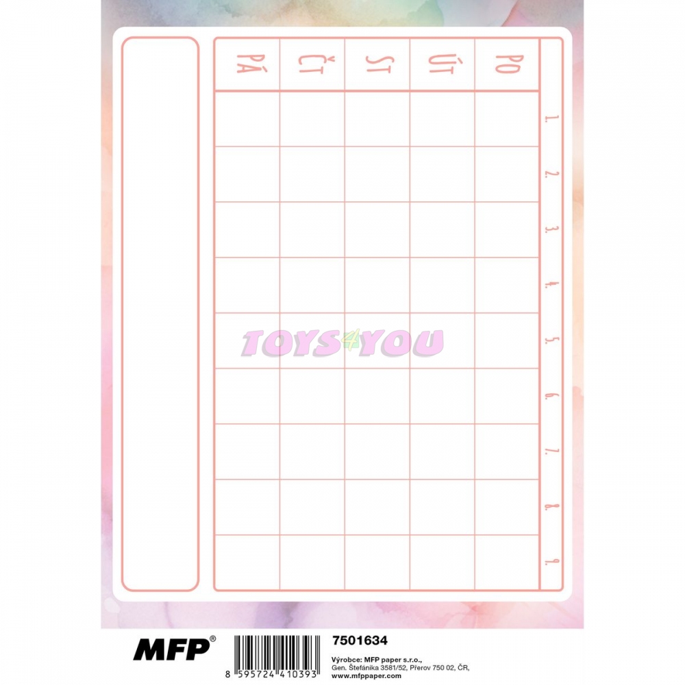 Roztomilost a praktičnost v jednom! Úkolníček potěší krásnou obálkou s jemným pastelovým designem a motivem kočičky s květinovým věnečkem. Je to nejen stylový, ale i užitečný pomocník, který vám pomůže udržet pořádek v úkolech a poznámkách. Formát A5, který se snadno vejde do aktovky a poskytne dostatek místa na všechny úkoly. Mějte své úkoly vždy pod kontrolou! ÚKOLNÍČEK OBSAHUJE: - osobní údaje - telefonní čísla - prostor pro poznámky - malá násobilka - geometrické vzorce a matematické vzorečky - vyjmenovaná slova - rozvrh hodin Formát: A5 Motiv: kočka Počet stran: 40 stran Uvedená cena je za 1 ks. Rozměr: 147mm x 210mm x 3mm (Š x V x H) Vyrobeno v EU.