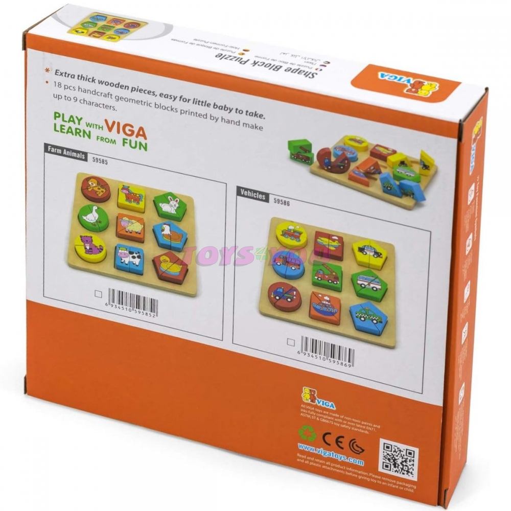 Dřevěné puzzle pro nejmenší v české krabici. Obsahuje 18 dílků, ze kterých lze složit 9 obrázků. Rozměry jednoho dílku cca 4,5 x 2,5 cm. Rozměry balení cca 20,5 x 21 x 3 cm. Značka: VIGA Délka: 20.50 cm Šířka: 3.00 cm Výška: 21.00 cm Upozornění: Určené pro děti od 18 měsíců. Obal není součástí výrobku. Před použitím odstraňte veškeré součásti obalu. Obal by měl být zachován - může obsahovat důležité informace. Výrobek se může od vyobrazení lišit. Země původu Čína.