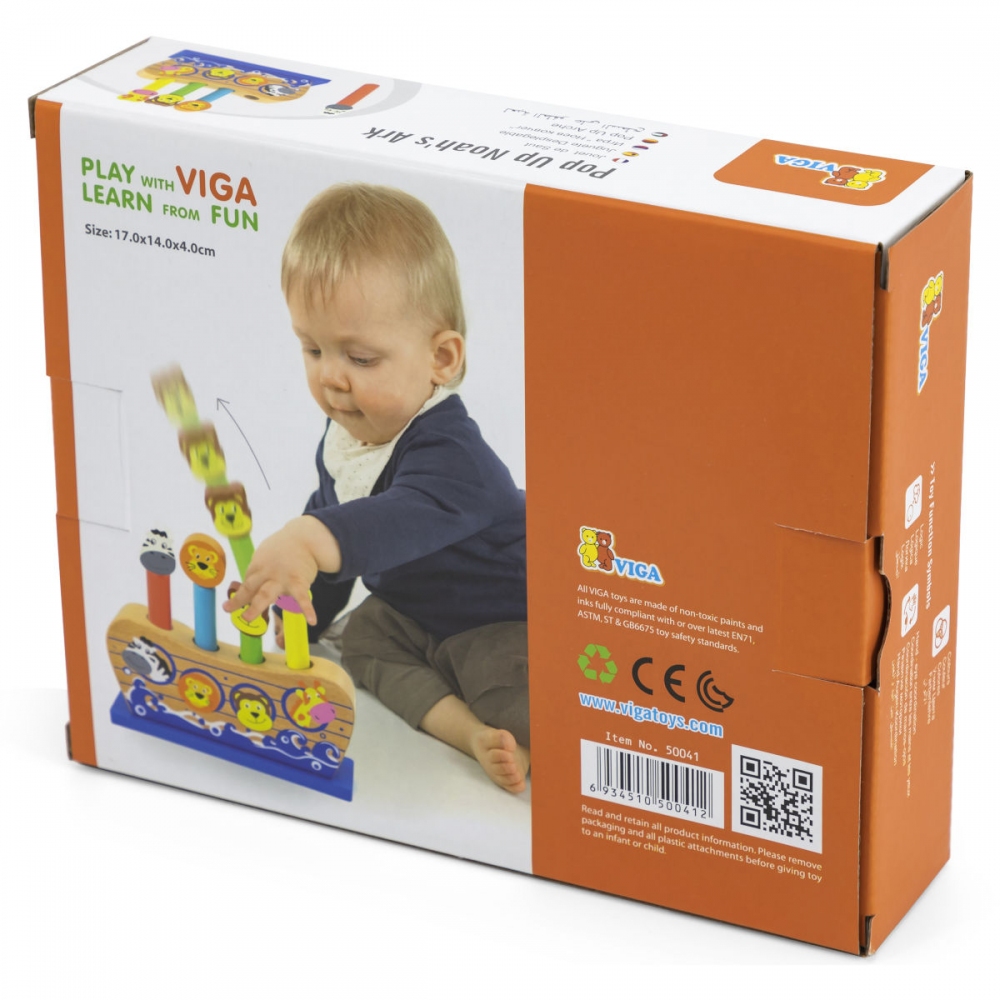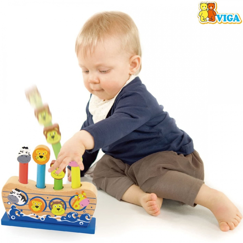 Dřevěná hra Noemova archa. Když dítě udeří do zvířátka, tak zvířátko vyskočí. Rozměry cca 17 x 14 x 4 cm. Rozměry balení cca 21 x 17 x 5,5 cm. Věk 18m+