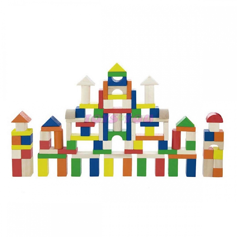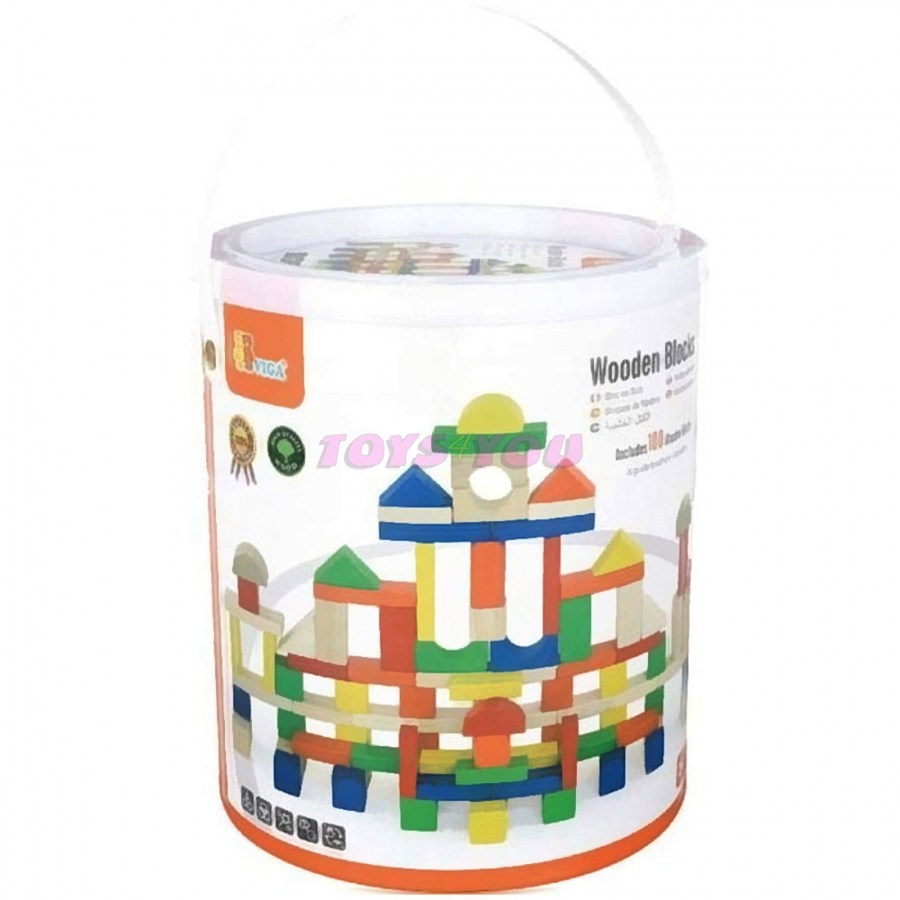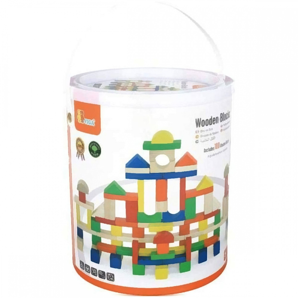 Dřevěná stavebnice v kyblíku. Obsahuje 100 dílků a obrázkovou brožuru s návody na stavění. Rozměry balení cca 18 x 21 cm. Velikost kostek 2,5 - 7,5 cm dle druhu. Věk 2+