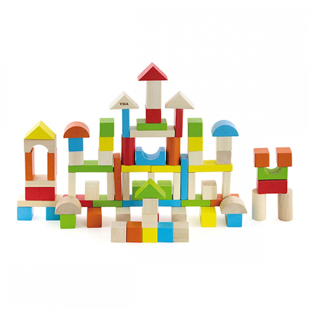 Dřevěná stavebnice v kyblíku. Obsahuje 80 dílků a obrázkovou brožuru s návody na stavění. Rozměry balení cca 18 x 18 cm. Velikost kostek 2,5 - 7,5 cm dle druhu. Věk 2+