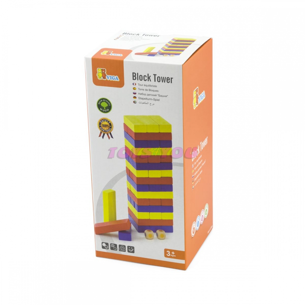 Dřevěná jenga věž barevná. Obsahuje 48 kostek Jengy a 2 hrací kostky.Rozměry balení cca 26,5 x 12 x 12 cm. Věk 3+