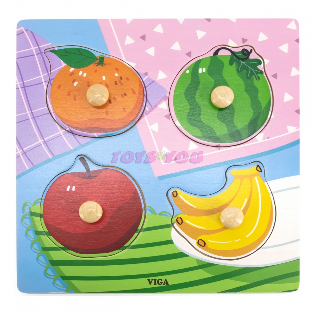 Viga Dřevěná vkládačka divoká ovoce. Dřevěná vkládačka s velkými úchytkami a čtyřmi vkládacími obrázky ovoce. Pod každým dílkem se nachází obrázek, který napomáhá správnému umístění. Věk: 18 měsíců+