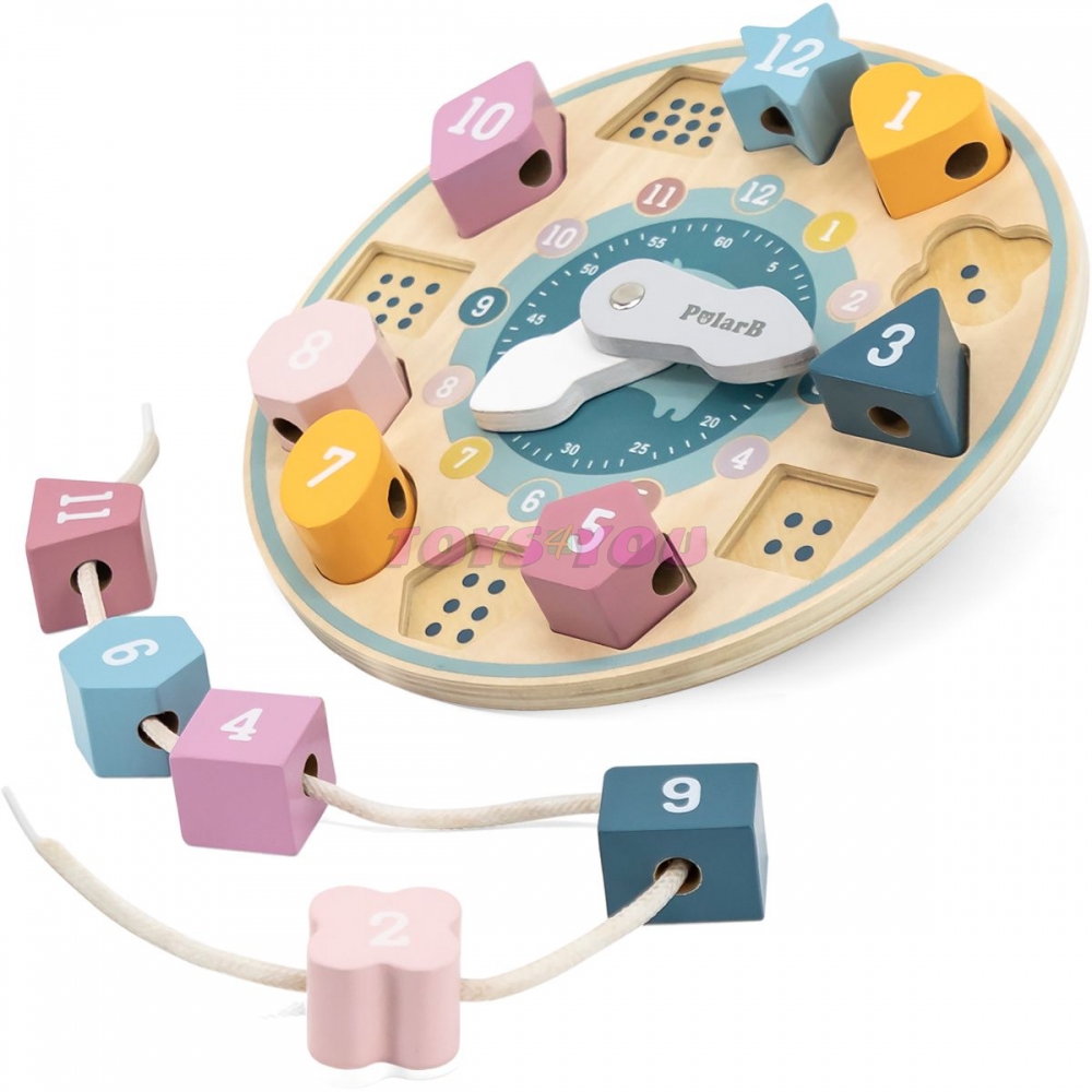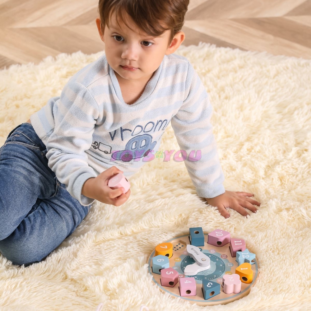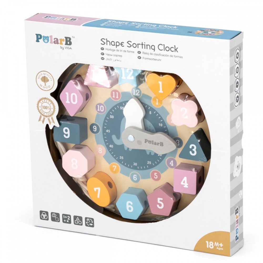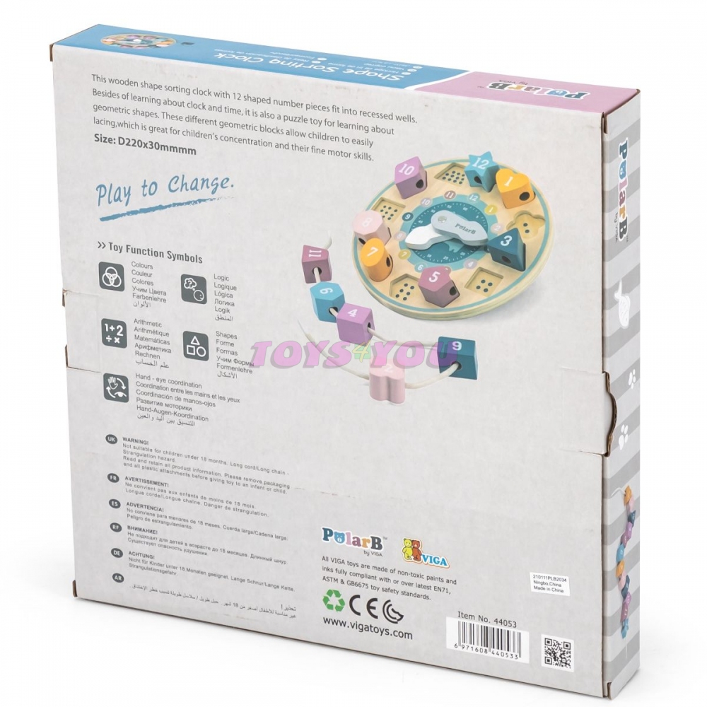 Dřevěné hodiny 3 v 1 v jemných pastelových barvách od značky Viga. Rozměr 26 x 26 x 4 cm. Číslice jsou v podobě dřevěných korálků a mají otvor. Jdou tedy navlékat na šňůrku jako korálky. To samozřejmě trénuje zručnost, rozlišování tvarů a barev. Podle tvarů můžou děti vkládat korálky do ciferníku. Jde tedy zároveň i o funkci vkládačky. Starší děti mohou srovnávat číslice s počtem teček v příslušném políčku. A konečně funkce hodin. Děti se hravě naučí hodiny. Dřevěné ručičky se otáčí kolem ciferníku. Nechte je nastavit stejný čas jako máte na hodinách doma. Vše je vyrobeno z nejkvalitnějšího dřeva. Viga je značka registrovaná v roce 2003, ale již působí ve více než 60 zemích po celém světě. Jejich inovativní nápady získaly uznání mezi ostatními v Evropě, USA, Austrálii a Japonsku. Zakladatelé společnosti upozornili na výsledky výzkumu ukazujícího vztah mezi hrou a učením v prvních letech vývoje dětí. Aby pomohl rodičům a vzdělávacím institucím při výchově dětí a zachránil je před virtuálním světem, který může do značné míry zkreslovat realitu, nabízí výrobce inovativní řadu z přírodních materiálů získaných při ekologických výrobních procesech. Bezpečnost a kvalita dřevěných výrobků je pro Vigi prioritou, výrobce dbal na to, aby barvy použité k nátěru hraček splňovaly bezpečnostní normy EN71 a ASTM. Věk: 18 m+