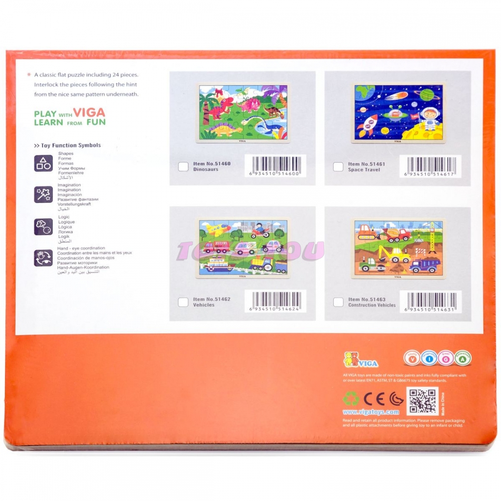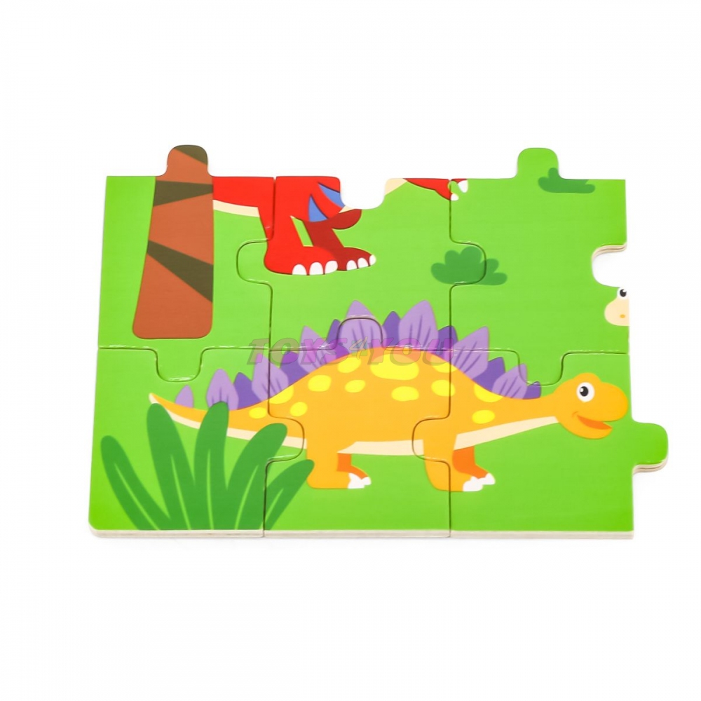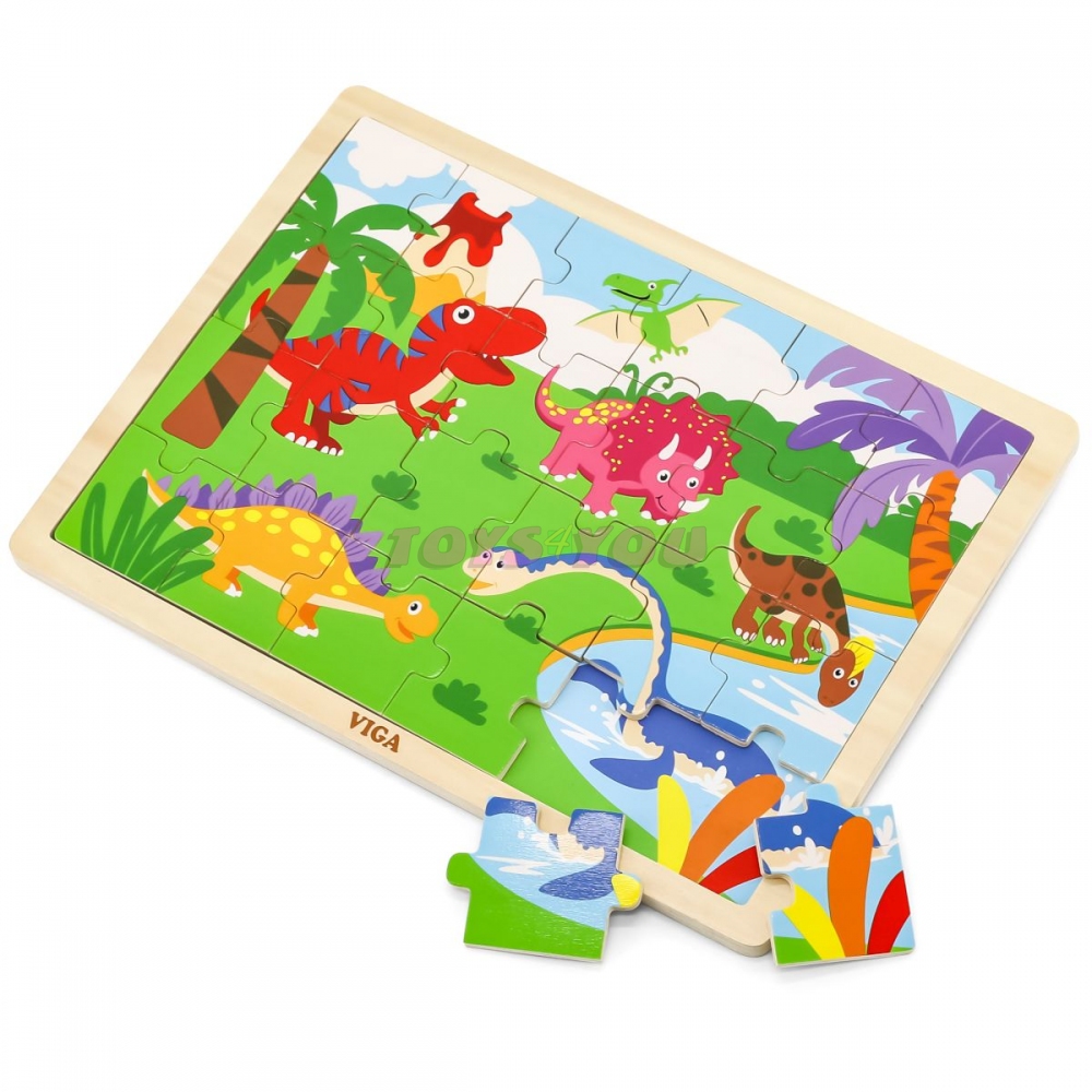 Dřevěné puzzle s obrázkem dinosaurů. Celkem 16 dílků. Rozměry obrázku cca 27,5 x 20 cm. Rozměry balení cca 30 x 27 x 1 cm. Věk 24m+