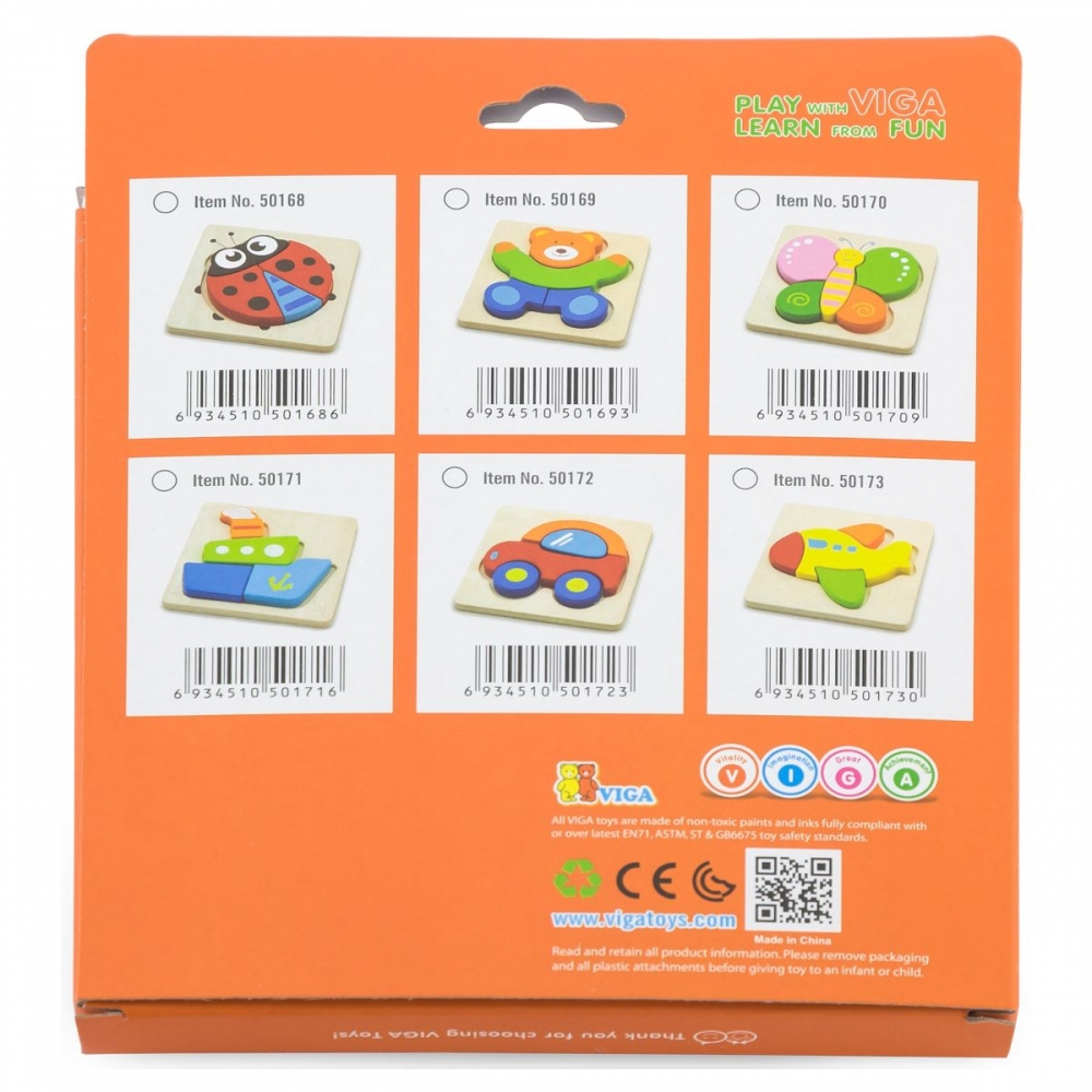Dřevěné puzzle - vkládačka pro nejmenší s motivem letadla. Rozměry berušky cca 12,5 x 13 cm. Rozměry balení cca 15,5 x 18 x 2 cm. Věk 18m+ Viga je značka registrovaná v roce 2003, ale již působí ve více než 60 zemích po celém světě. Jejich inovativní nápady získaly uznání mezi ostatními v Evropě, USA, Austrálii a Japonsku. Zakladatelé společnosti upozornili na výsledky výzkumu ukazujícího vztah mezi hrou a učením v prvních letech vývoje dětí. Aby pomohl rodičům a vzdělávacím institucím při výchově dětí a zachránil je před virtuálním světem, který může do značné míry zkreslovat realitu, nabízí výrobce inovativní řadu z přírodních materiálů získaných při ekologických výrobních procesech. Bezpečnost a kvalita dřevěných výrobků je pro Vigi prioritou, výrobce dbal na to, aby barvy použité k nátěru hraček splňovaly bezpečnostní normy EN71 a ASTM.